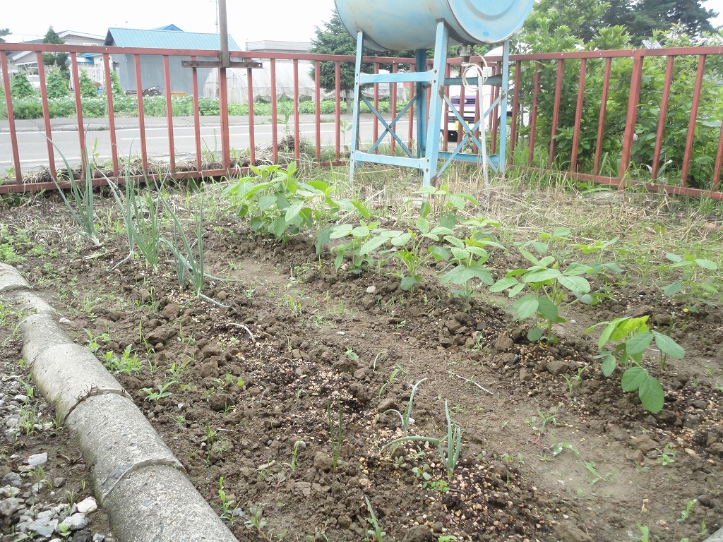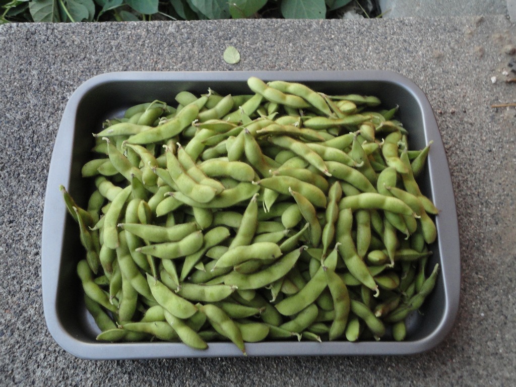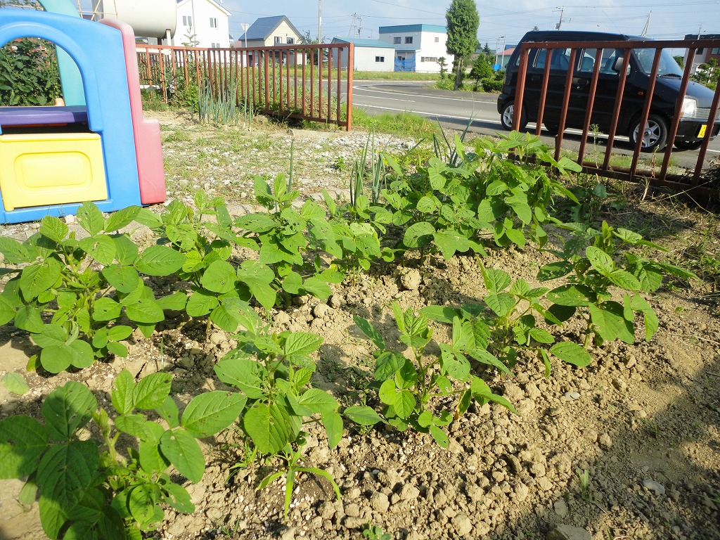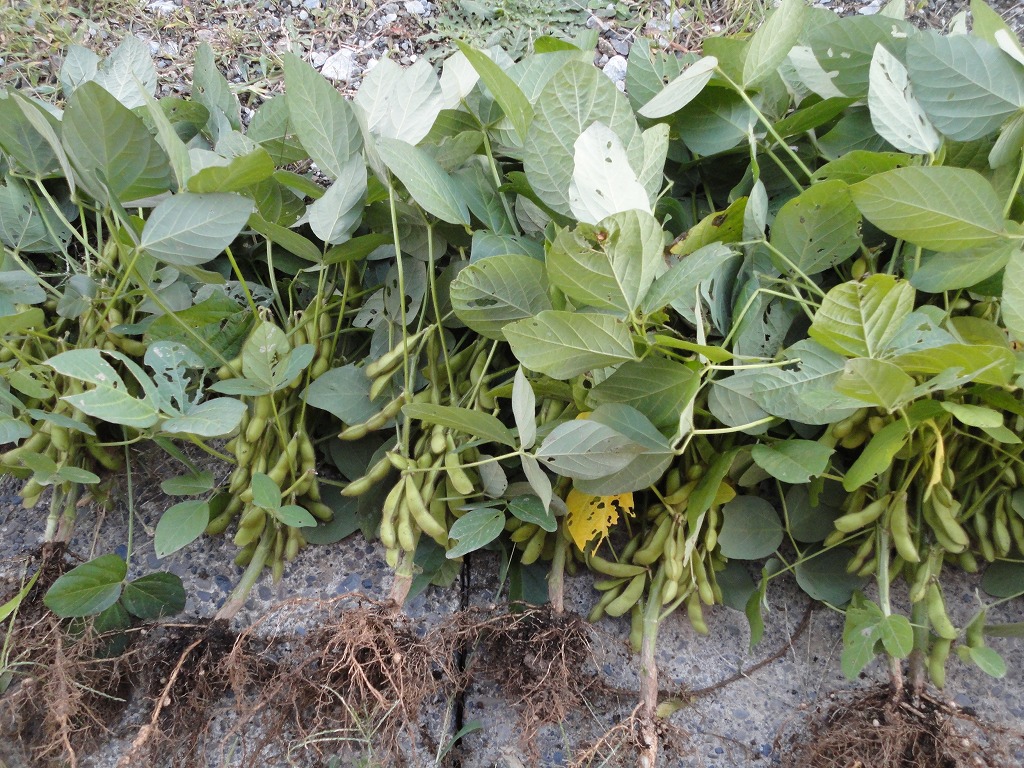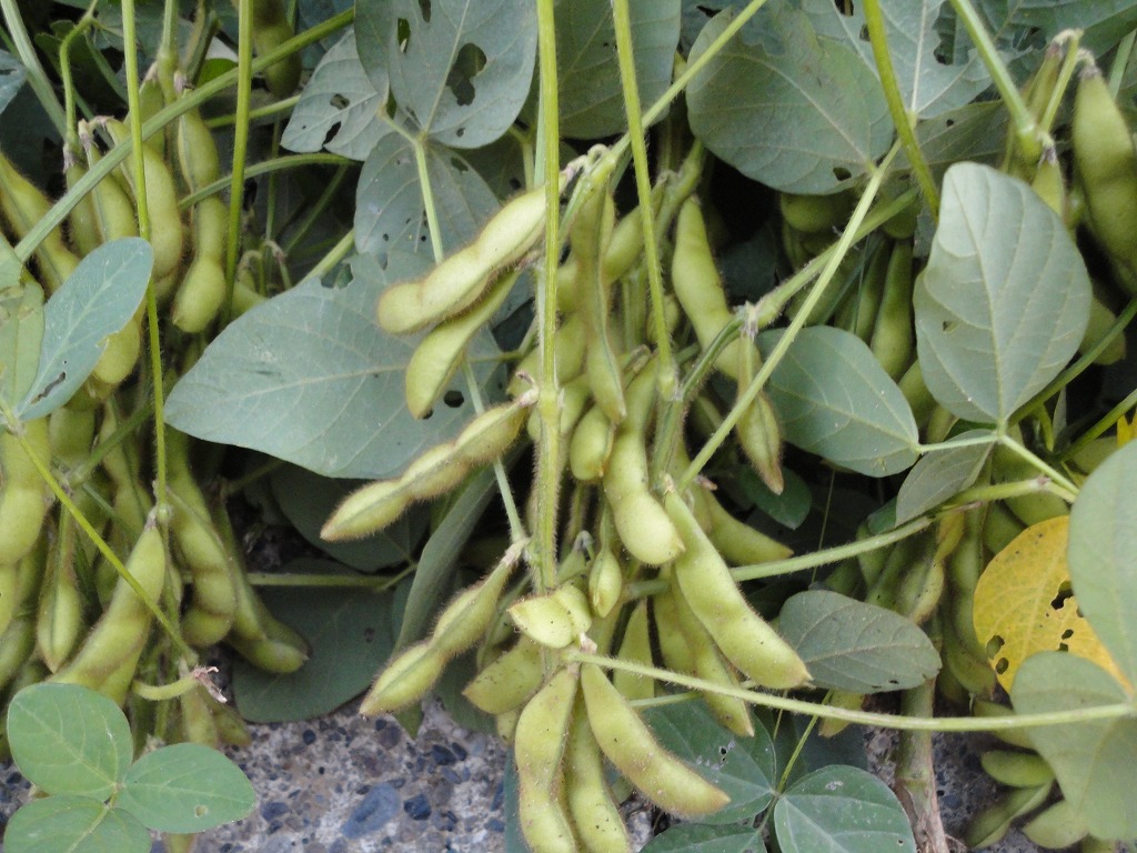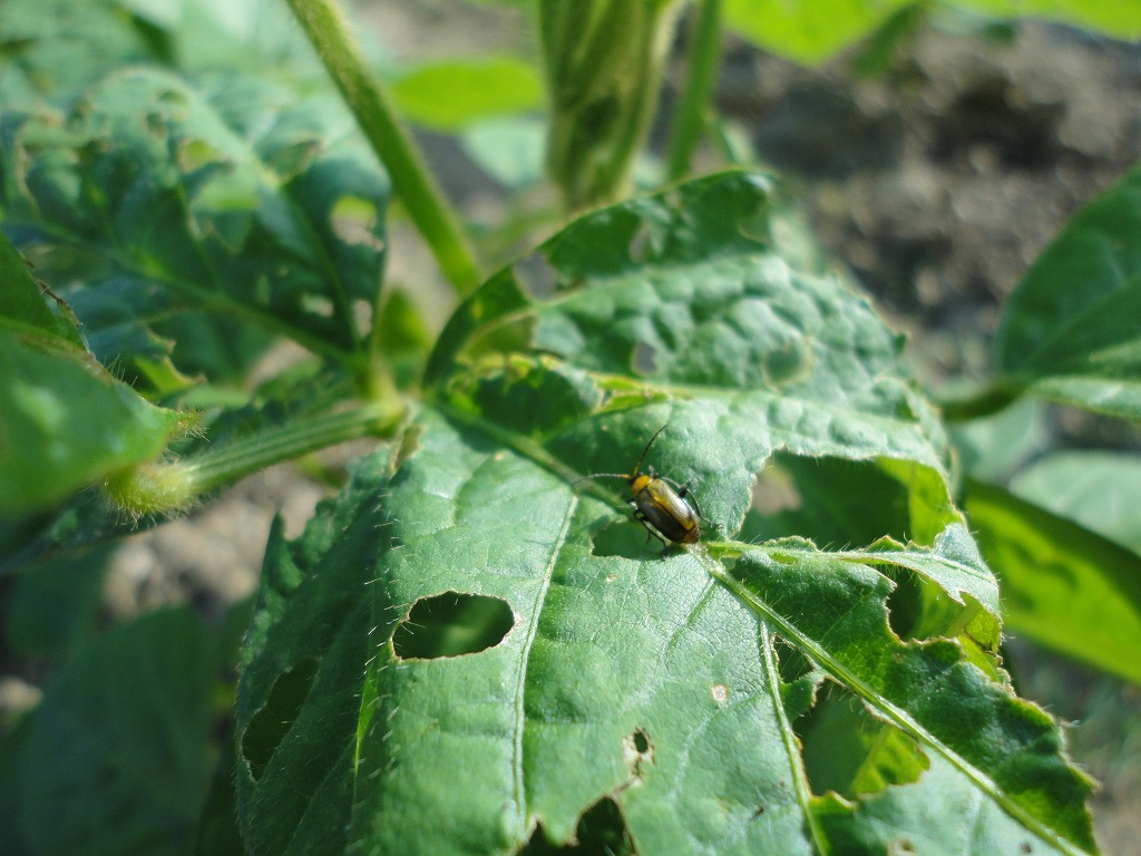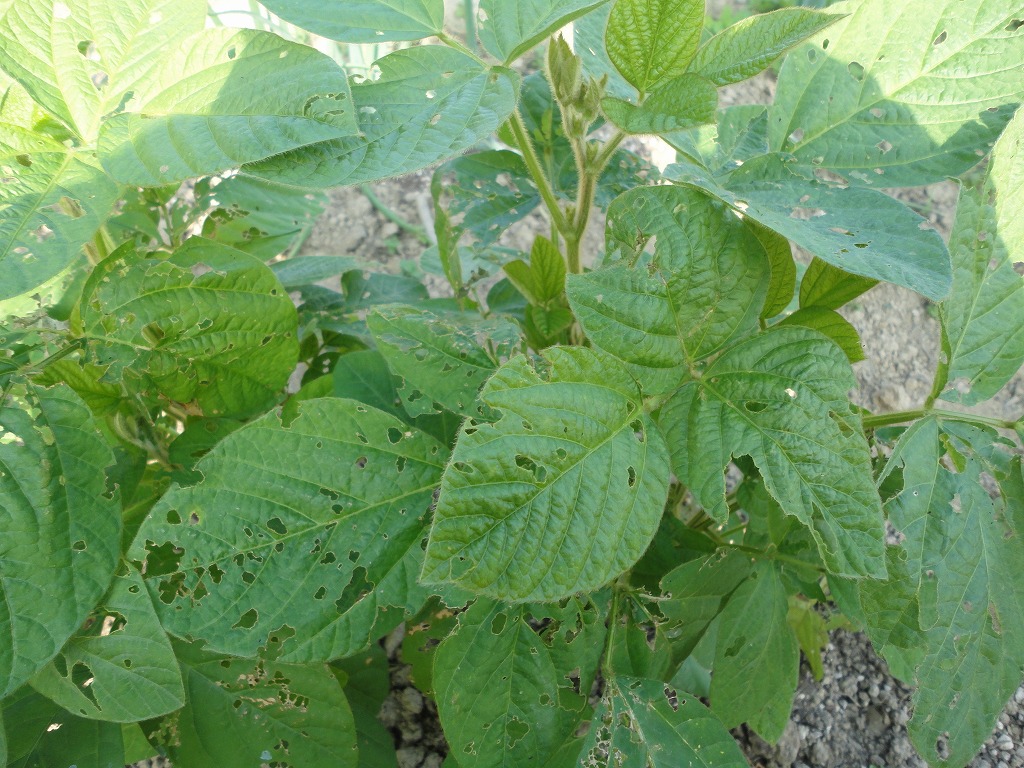 最近、エダマメが大きくなってきましたが、同時に虫が葉っぱを食べる被害が出ています。