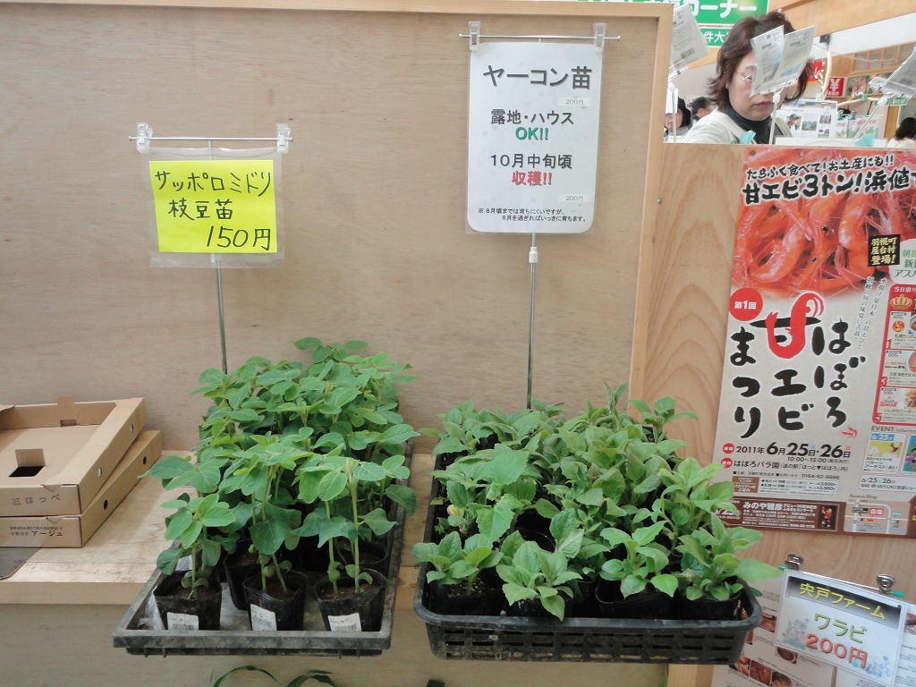 スイートコーン、枝豆、ミニトマト、花等、沢山の苗物もご用意しています。