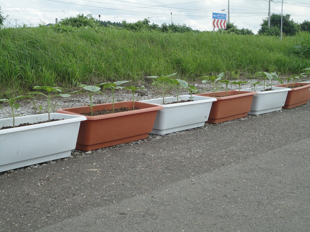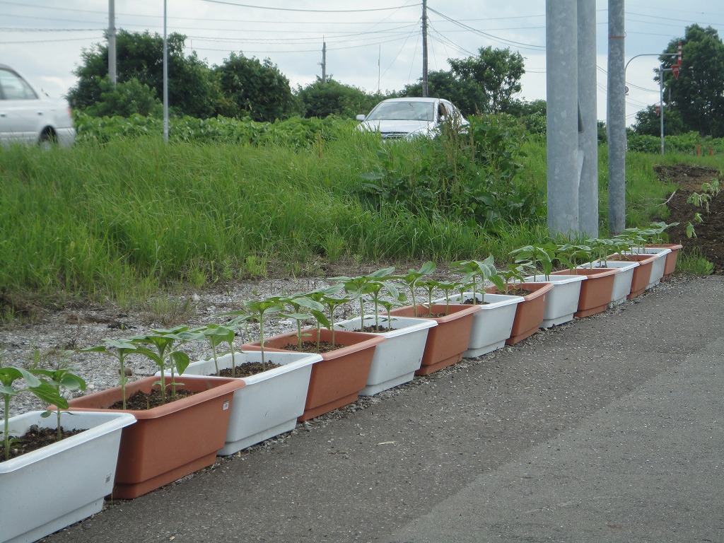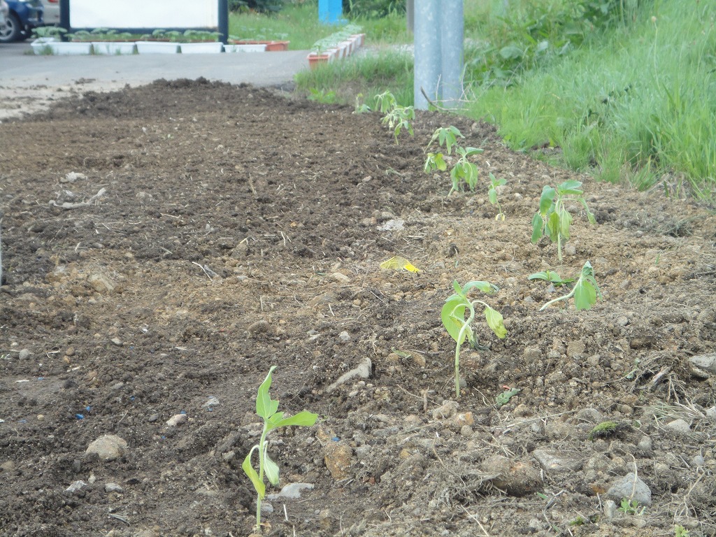 先日、24本ひまわりの苗が届き、会社道路沿いの敷地に植えました。